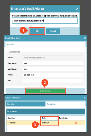 Next, enter the user’s email address and click OK. In the pop-up, you can enter the user’s name and phone number, then click Create New User. The following pop-up allows you to change the users role permission. Users default to the Outreach role.