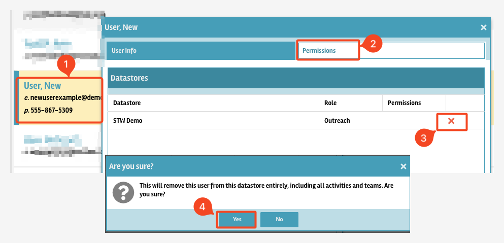 To remove a user from your datastore, navigate to the Users tab on the left, then click on their name. Click on the Permissions tab in the pop-up, and then the red X to the right of their role. A confirmation will pop up, prompting you to confirm you want to remove them. Click Yes.