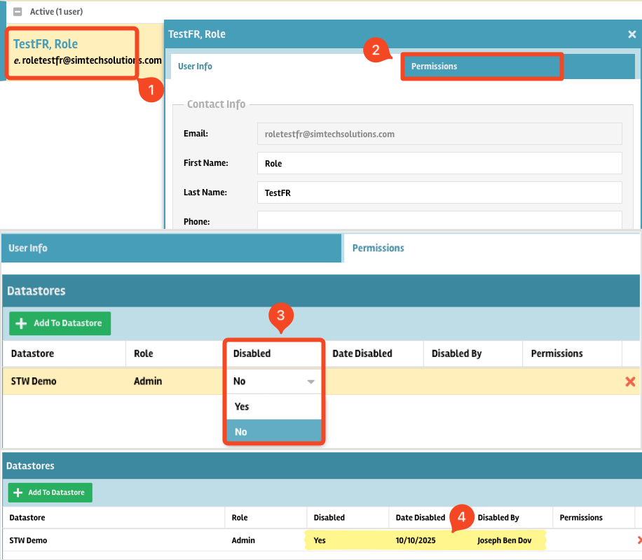 To deactivate a user, first click on their name in the Users tab on the left. Then, click on the Permissions tab. Lastly, click the drop-down menu in the “Disabled” column and choose “yes”. Once this saves it also includes a record of who disabled the user and when.